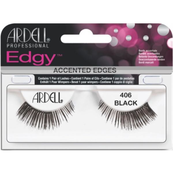 Ardell Pestañas Edgy 406. Pestañas de fiesta sexys y vanguardistas. Con la silueta alada súper coqueta y el volumen más audaz y dramático solo en las esquinas exteriores. Volumen medio, largo. Pestañas aladas.