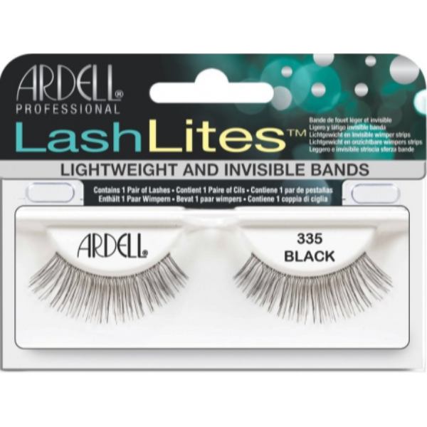 Ardell Lashlites 335. Color negro. Muy naturales. Volumen ligero, longitud corta. Banda invisible en la base de las pestañas. Ideales para bodas. Color negro. Reutilizables hasta 5 veces. Aspecto natural. Fáciles de aplicar. Retirar cuidadosamente. Aplicar una banda de adhesivo LashGrip. Esperar 30 segundos y colocar.