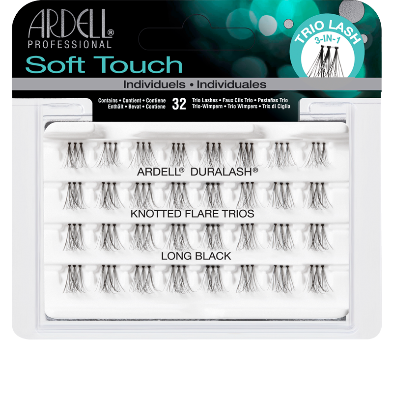 Ardell Soft Touch Trios largas. Tres grupos de Soft Touch unidos en una banda invisible para una aplicación más rápida. Las pestañas Soft Touch tienen la punta cónica y son ultra ligeras, lo que les da un aspecto más natural y hace que se integren fácilmente con la pestaña natural.