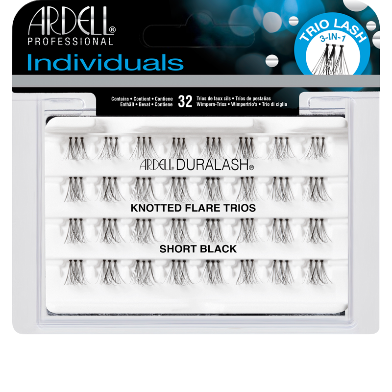 Ardell Trios Individual Pestañas Cortas Negras. Consigue un aspecto personalizado de las pestañas aún más rápido con los tríos. Ahorrarás mucho tiempo de colocación. Tres grupos de pestañas de grupo en una banda para que puedas aplicar más en menos tiempo.